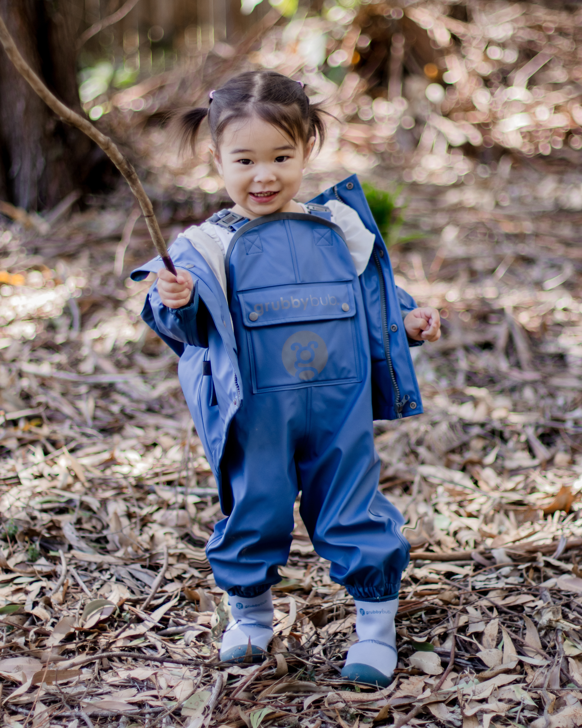 Our Grubberalls (Coveralls, or Grubby Overalls, get it?) are made for play in Australian weather. Specifically designed for the long, cool days of spring and autumn, these overalls will keep them dry and cosy, but not overheated. Super soft, breathable and flexible to move with their bodies, mini adventurers will be comfortable all day long. They will adore the treasure pocket we built in, too!